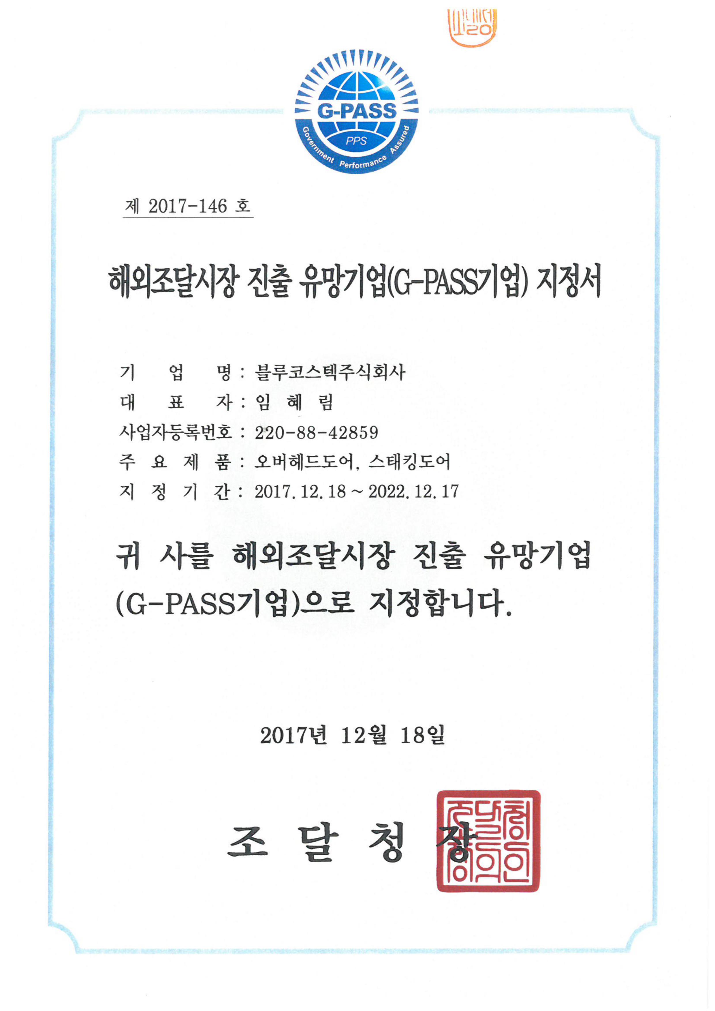인증서 및 수상내역 HOME 회사소개 인증서 및 수상내역 특허-디스플레이어가설치된오버헤드도어 특허-긴급출동알림 특허-안전장치 특허-개폐구동장치 특허-오버헤드도어 해외조달시장진출유망기업지정서 연구개발전담부서인정서 기술평가 우수기업 인증서 위험성평가 인정서 건설업등록증 환경경영ISO인증서 품질경영ISO 인증서 여성기업 확인서